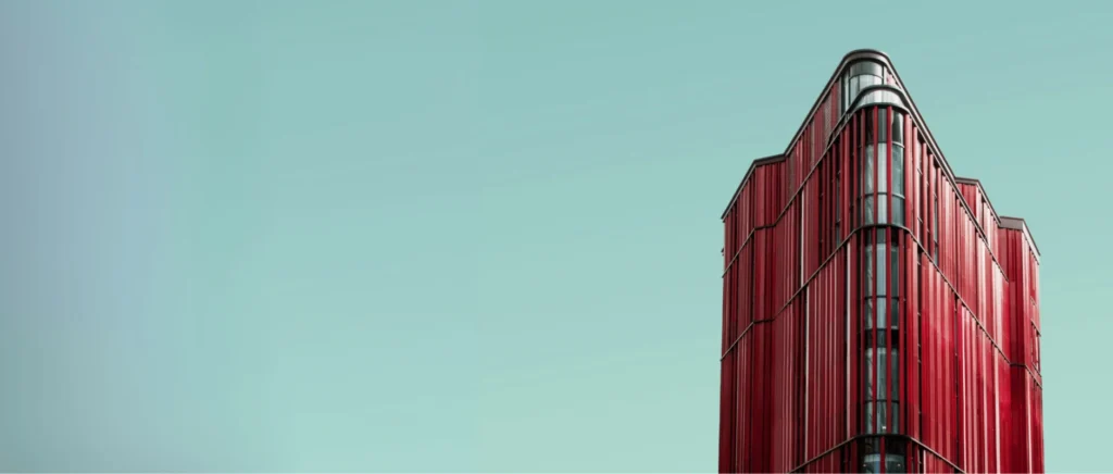 A striking modern structure defined by bold red panels and clean vertical lines. The curved glass corner adds lightness and elegance to the sharp, sculptural form.
